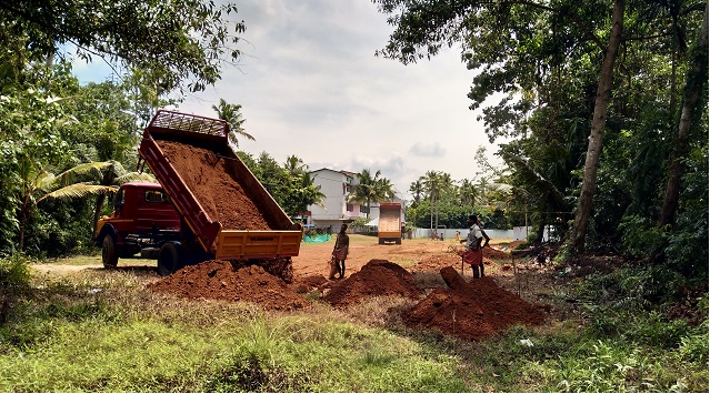 Mittlerweile hat das Vorhaben zur Erstellung eines Sportplatzes weitere Fortschritte gemacht. Die wasserführenden Kanäle wurden zugeschüttet. Die besondere Schwierigkeit besteht darin, ein so grosses Volumen mit entsprechendem Material zu verfüllen. Sand, Schotter und Erde müssen aus ca. 40 km Enfernung geholt werden und sind entsprechend teuer. Daher wurde ein Teil des Volumens (Untergrund der Kanäle) mit Resten aus der Kokosmattenproduktion verfüllt, ein Material, das kostengünstig und in grossen Mengen zur Verfügung steht.